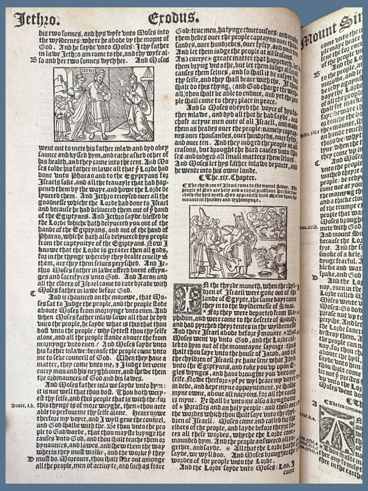 Visually and typographically, the Great Bible is one of the most striking early English Bibles. It contains nearly eighty woodcut illustrations, with text printed in two-column black letter. The beginning of each chapter features historiated or floriated woodcut initials, and occasional metal-cast capitals appear throughout. The general and New Testament title pages feature the striking woodcut described above. Title pages to the second, third, and fourth sections are also printed in red and black, surrounded by rich woodcut borders relevant to each portion of Scripture.