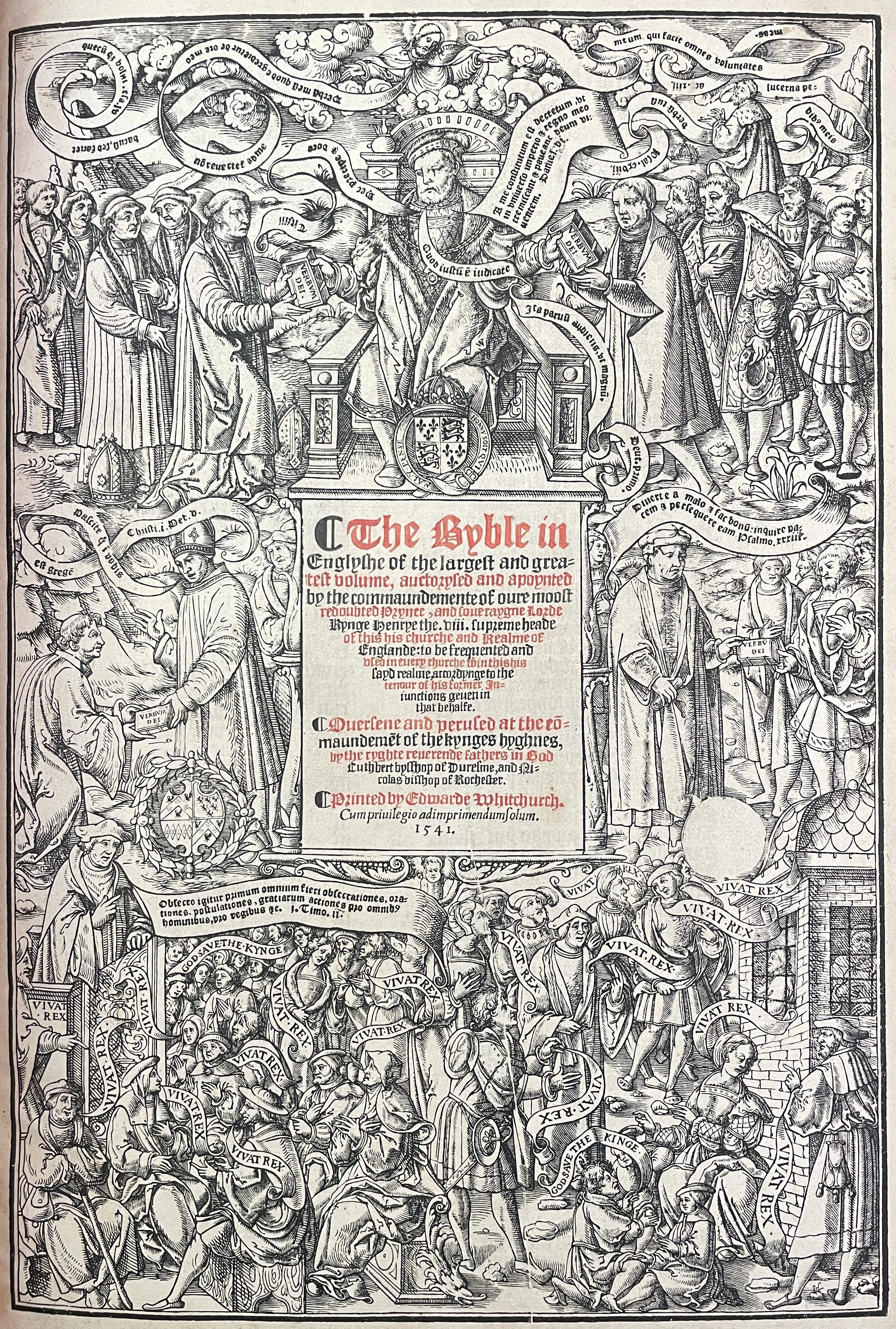 The title page of the Great Bible tells the story. At the top, Henry VIII dominates the scene, symbolizing the replacement of papal authority with royal supremacy. Above him, God is barely visible among the clouds. To Henry’s left and right stand Archbishop Cranmer and Thomas Cromwell, who pass the Verbum Dei to the clergy and nobility.